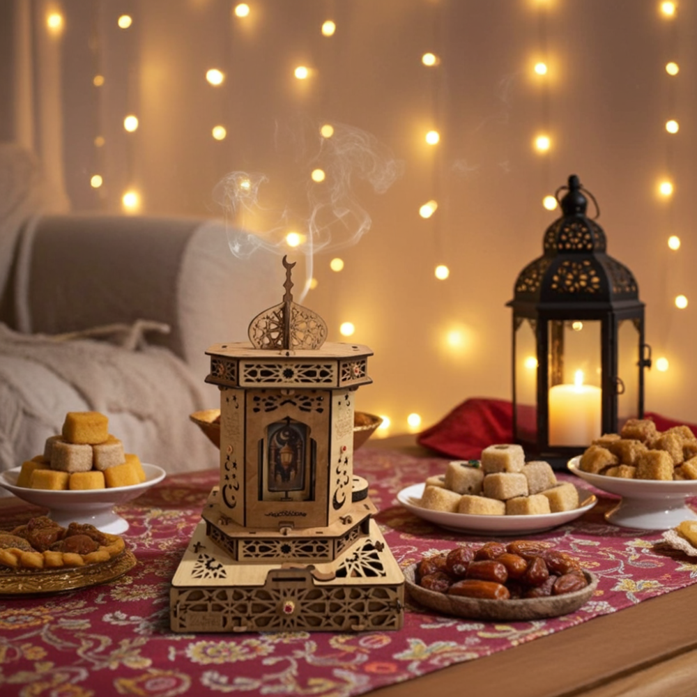 استمتع بلحظات تبخير ساحرة مع مبخرة فانوس رمضان الكهربائية (مبخرة الفانوس الذكي)، حيث يلتقي عبق البخور بجمال التصميم الإسلامي العصري في مبخرة فاخرة مصنوعة من الخشب الطبيعي بتصميم مستوحى من أجواء رمضان الدافئة وصور متحركة، تمنحك تجربة تبخير راقية جذابة في كل مرة.