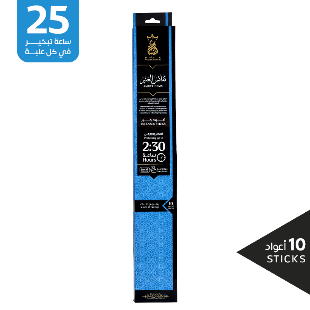 نفس الخليط الرائع لنفائس العنبر الذي يجعلك تغوص في بحار من الروعة يتدفق فيها العنبر الراقي بمزيج من المكونات المنعشة في كل عود من أعواد بخور الند في بخور انسام نفائس العنبر. في أعواد ند ساعتين ونصف من بخور أنسام